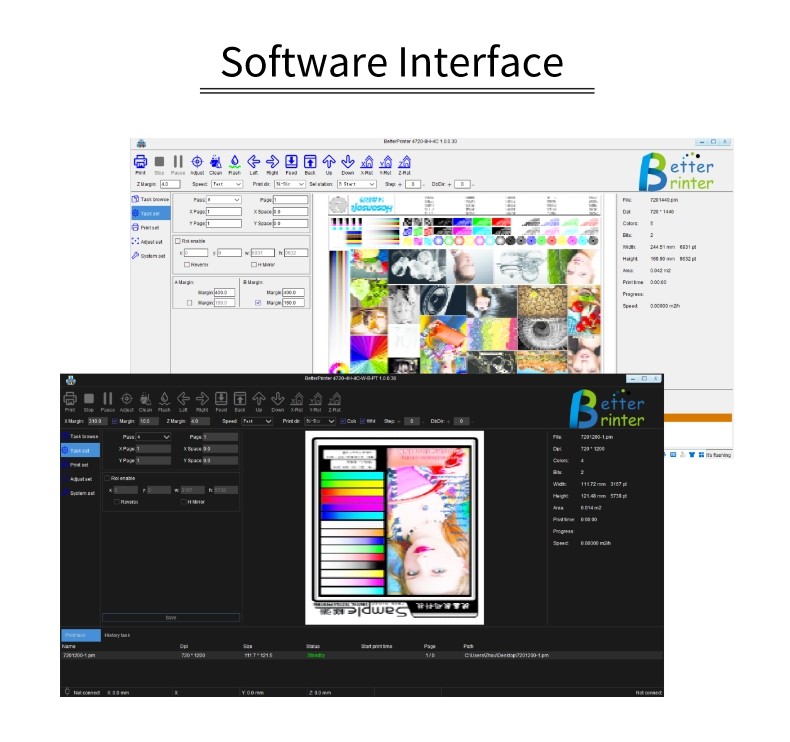 | نرم افزار RIP | نرم افزارهای RIP اصلی مانند MainTop، Photoprint، UltraPrint، ONYX، Wasatch و غیره | پشتیبانی از عملکرد | مجهز به عملکرد RIP، چاپ چندگانه، چاپ چرخه چند سفارش، چاپ ضد برخورد، اندازه گیری خودکار ارتفاع، چاپ نقطه تغییر، چاپ خاموش شدن تجهیزات، تنظیم مجدد خودکار، چاپ قطع شده، تشخیص کمبود کاغذ، خودآزمایی انباشت جوهر و غیره |